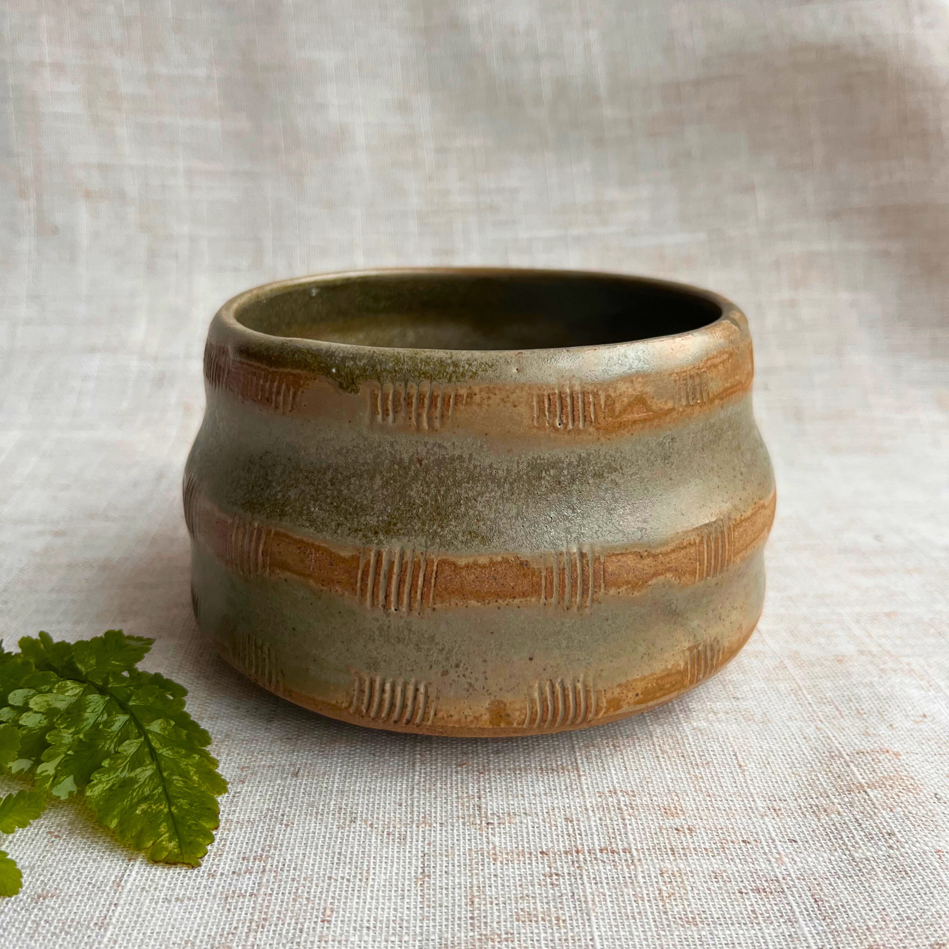 Wheel‑thrown and finished with a soft green glaze, showing the natural stoneware detail underneath, this piece echoes the quiet beauty of lichen and moss found deep in the woods. Its organic tones and tactile feel make every use feel like a small retreat into nature.