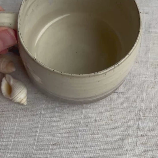 Bring a touch of coastal charm into your home with our handmade ceramic mug, glazed in speckled cream and brown glaze, finished with a pink/white iridescent coating, inspired by sun‑bleached shells. Each piece is shaped, smoothed, and glazed by hand in our New Forest pottery studio, making every mug beautifully unique.