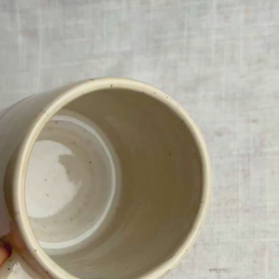 Bring a touch of coastal charm into your home with our handmade small ceramic mug, glazed in speckled cream and brown glaze, finished with a pink/white iridescent coating, inspired by sun‑bleached shells. Each piece is shaped, smoothed, and glazed by hand in our New Forest pottery studio, making every mug beautifully unique.