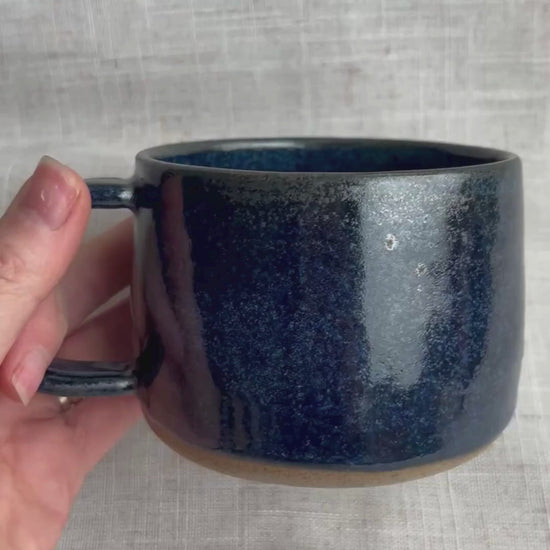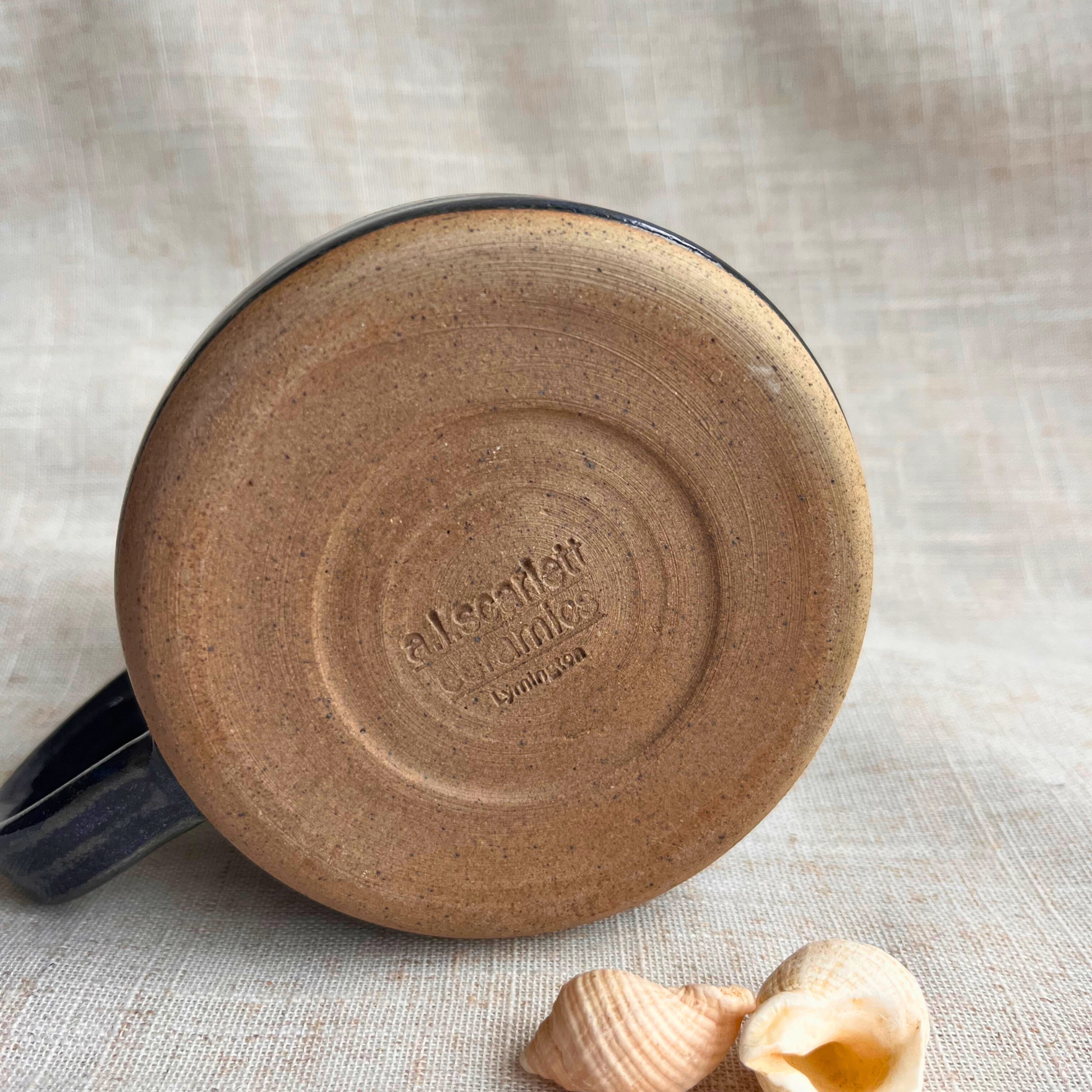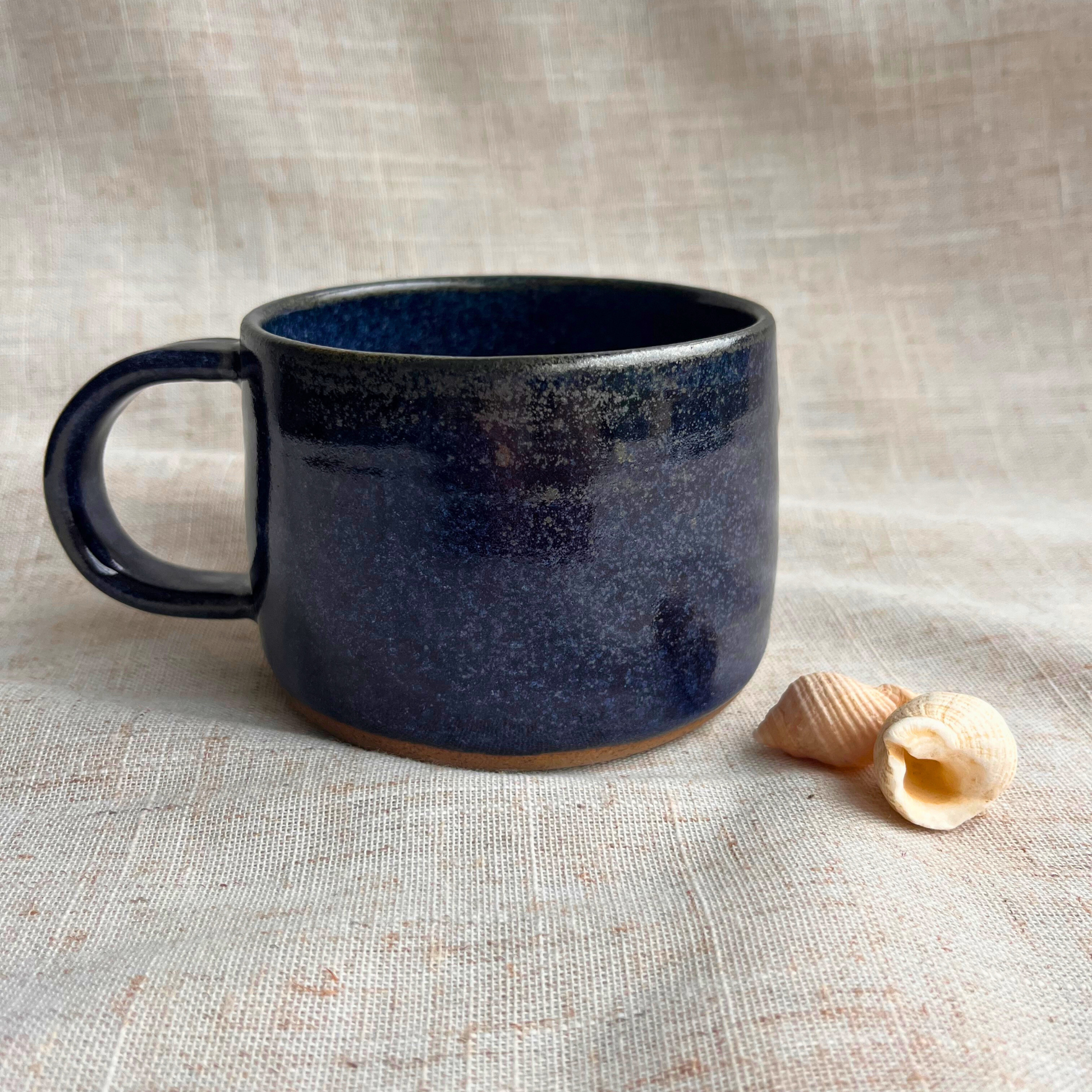 Handmade in our garden pottery shed in Lymington, this navy blue ceramic mug is crafted with a deep, glossy glaze inspired by twilight coastal walks along the New Forest shoreline. Its rich tones and smooth stoneware finish make it the perfect coastal‑inspired mug for your morning coffee, evening tea, or slow moments at home.